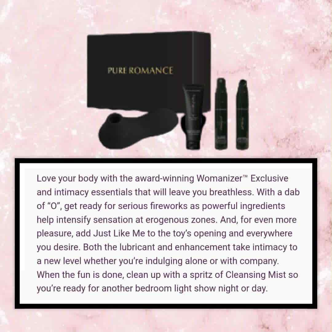 Love your body with the award-winning Womanizer Exclusive and intimacy essentials that will leave you breathless. With a dab of "O", get ready for serious fireworks as powerful ingredients help intensify sensation at erogenous zones. And, for even more pleasure, add Just Like Me to the toys opening and everywhere you desire. Both the lubricant and enhancement take intimacy to a new level whether you're indulging alone or with company. When the fun is done, clean up with a spritz of Cleansing Mist so you're ready for another bedroom light show night or day. Set contents: Womanizer Exclusive, "O" Vanilla Frosting, Travel Size Just Like Me, Travel Size Cleansing Mist.